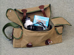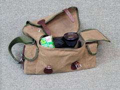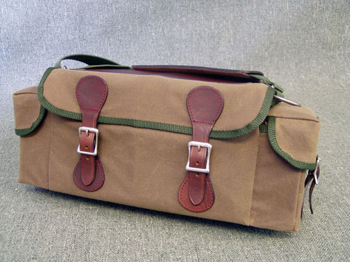 Although the smallest in size, this kit bag has a multitude of uses. The small shoulder strap, pad and d-ring are used on a compact body that features two buckled side pockets and a flat back pocket. The smaller size dictates an interior divided into three compartments with a hard/soft bottom.
